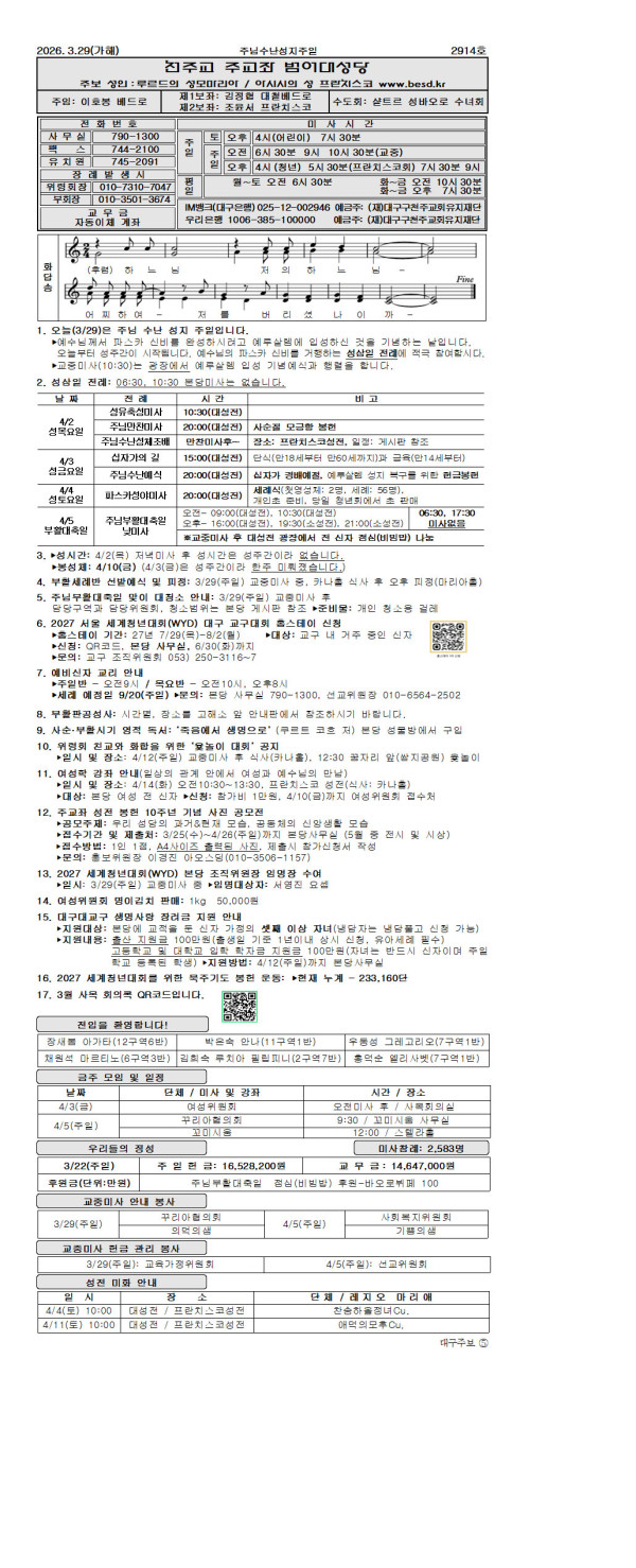 주님수난성지주일(3/29) 페이지 정보 작성자 범어대… 댓글 0건 조회 97회 작성일 26-03-27 15:58 목록 답변 본문 주님수난성지주일(3/29) 3월 다음글사순제5주일(3/22) 26.03.20